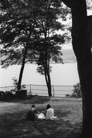 In this monochromatic capture, two figures sit in quiet reflection, enveloped by nature's embrace. A sprawling tree, with its rugged bark and sprawling branches, provides a protective canopy over them, its foliage dappled with sunlight. Underneath, the couple finds solace, seemingly immersed in their own world, shielded from the cacophony of the outer realm. The serenity of the lake in the background adds a touch of introspection, with its placid waters reflecting the hazy horizon. A frail iron railing separates the land from the water, symbolizing the fine line between the tangible and intangible, reality and reverie. The lush green grass beneath the couple is a testament to life's simpler joys, as they sit cross-legged, with food and belongings scattered around, savoring the present. This photograph speaks volumes of the fleeting moments we often overlook, reminding us of the beauty in everyday silences, the stories untold in unspoken words, and the profound connection humans share with nature.
